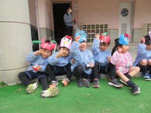 2月3日の節分の日。節分にちなんで、幼稚園園庭で学年ごとに豆まきをしました。