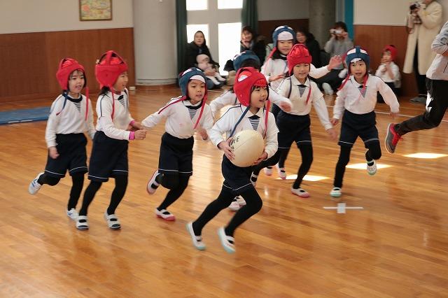 トピックスTOPICS 全力で取り組んだラグビー ~体操あそび参観(年長)~ 2018年01月11日 今日は年長組の体操あそび(ラグビー)参観日でした。 体操の先生である森ちゃん先生、そして参観に来ていただいたお家の方と一緒に、最初はパスの練習で、おとなチーム・子どもチームに分かれて、いざ対決!子どもたちも大人に負けない速さで、なかなかいい勝負になりました。 パスの練習が終わると、次はいよいよ子ども同士で赤チーム・青チームに分かれての試合です。男の子も女の子も全力で頑張り、結果1点差や、中には同点で引き分けに終わったクラスもあり想像以上に白熱した戦いを見せてくれました。 << 前へ 一覧へ 次へ >>