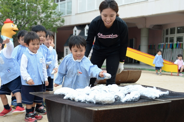 トピックスTOPICS 秋の味覚 ~やきいもパーティー~ 2019年10月18日 今日は、先週の金曜日にみんなが頑張って掘ったさつまいもを焼く、やきいもパーティーがありました。子供たちがさつまいもを一人ひとつずつ持ち、網の上へ並べて焼きます。 40~50分ほど待つと、ホカホカのやきいもの出来上がりです!先生や友達と一緒に食べて、秋の味覚を堪能しました。自分で苦労してとったさつまいもの味は一味違い、みんな「美味しいー!」と大喜びでした。 << 前へ 一覧へ 次へ >>